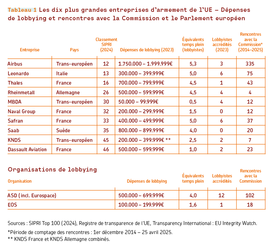 ASD, EOS et les dix plus grandes entreprises d’armement de l’UE ont participé à des centaines de réunions avec la Commission européenne et des eurodéputés ces dernières années (voir tableau 1)3. Toutes ne portaient pas sur des sujets militaires, certains de ces groupes ayant des activités diversifiées, mais ces chiffres témoignent de liens étroits. Cette relation est renforcée par leur présence dans des salons de l’armement, des conférences, etc. Les entreprises sont également invitées à des auditions au Parlement européen, tandis que les ONG critiques ou les chercheurs indépendants ont rarement voix au chapitre. En d’autres termes : partout où ils vont, les lobbyistes croisent toute l’année décideurs européens et commissaires.