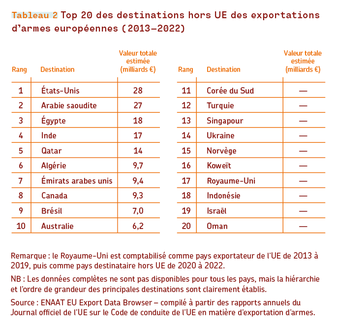 Les exportations européennes d’armes ont considérablement augmenté lors de la dernière décennie. Leur volume annuel dépasse désormais les 30 milliards €. Ensemble, les pays de l’UE forment désormais le deuxième bloc exportateur d’armes au monde, après les États-Unis (qui exportent environ 1,5 fois plus). Leurs principaux clients sont les États-Unis et l’Arabie saoudite.